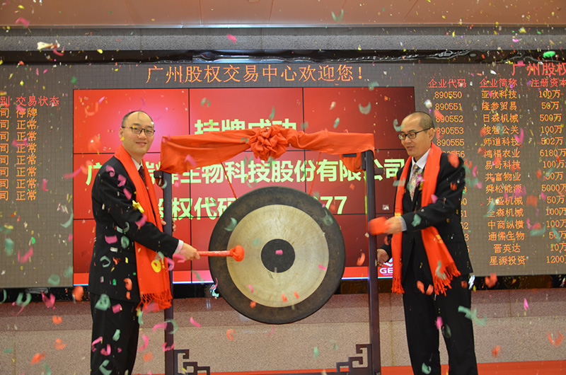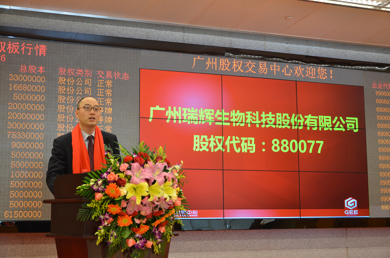 2016年12月30日,廣州瑞輝生物科技股份有限公司成功掛牌廣州市股權(quán)交易中心,本次掛牌廣交所的共有4家企業(yè),瑞輝生物是第一個(gè)發(fā)表講話和敲鐘的企業(yè)。