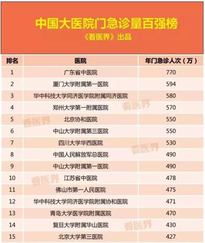中國(guó)大醫(yī)院門(mén)診量百?gòu)?qiáng)究竟是哪些醫(yī)院?哪些醫(yī)院門(mén)急診量出現(xiàn)了大幅增長(zhǎng)?繼去年推出2015年中國(guó)大醫(yī)院門(mén)診量排行榜后,2017年3月,《看醫(yī)界》再次重磅推出“中國(guó)大醫(yī)院門(mén)診量百?gòu)?qiáng)榜”。