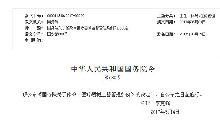 5月4日,國務(wù)院總理李克強(qiáng)簽署了國務(wù)院令第680號(hào),公布了《國務(wù)院關(guān)于修改〈醫(yī)療器械監(jiān)督管理?xiàng)l例〉的決定》,自公布之日起施行。