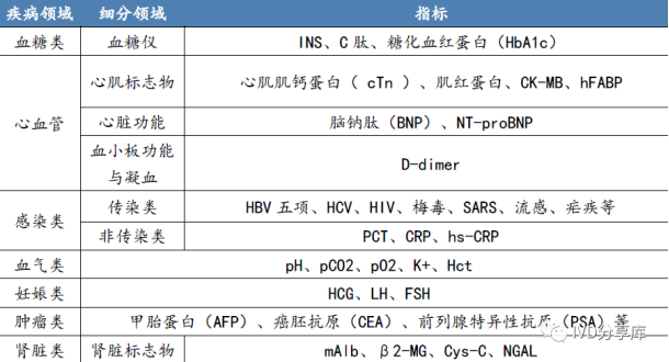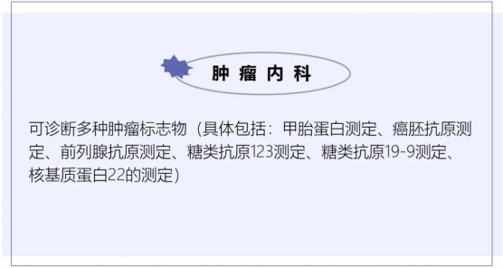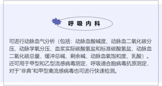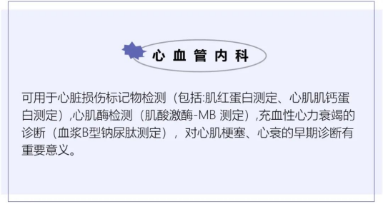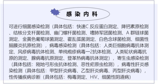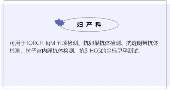 可用于心臟損傷標記物檢測、動脈血氣分析、肝功能檢查、血紅蛋白定量、糖代謝紊亂、血脂代謝異常、血液電解質(zhì)、細菌感染檢測、病毒感染檢測、寄生蟲感染檢測、病毒性肝炎感染檢測、性傳播疾病診斷、多種腫瘤標志物、TORCH-IgM 五項檢測、抗β-HCG的金標早孕測試等。